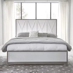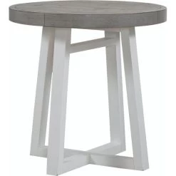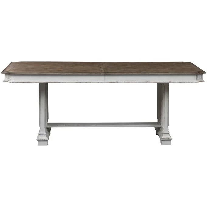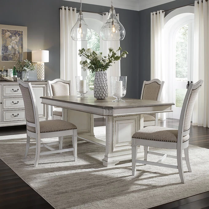 Gather with loved ones and dine in pure elegance with this timeless Abbey Park set. Constructed of poplar and rubberwood solids with cathedral white oak and birch veneers, each masterfully-crafted piece blends traditional European design influences for a truly unique style. Anchored by a raised panel pedestal base, the expandable trestle table features a veneer top, shaped corners, and fluted accents. Four matching chairs with tapered legs, fluted accents, and chenille upholstery with a nail head trim complete this luxurious set. Antique white finishing with heavy distressing gives each piece the look of a rare, priceless find.