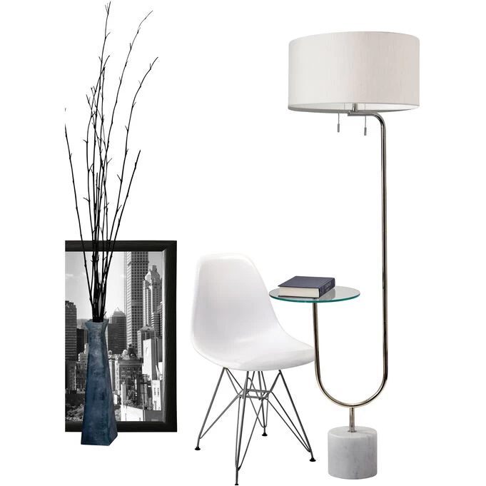 Turn the cool factor of your space up with the Sloan Floor Lamp. This whimsical minimalist design is the truly unique invention of the design experts at Adesso. A thick marble base supports a bifurcated stand that separates to support a table and the lamp. The classic white shade completes this chic piece. There are two fixtures with separate pull-chain switches, so you can adjust the light based on mood or purpose. Use the table to display an objet d’art, a plant, or just use it as a handy spot to set your drink. Buy the Sloan Floor Lamp at Slumberland today.
