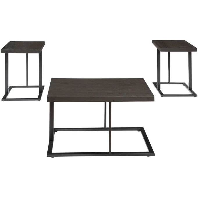 Function meets style in the Airdon 3 pack of accent tables. A great choice for any contemporary décor, these tables feature a cantilevered design and an “urban rustic” feel. The bases are made of aged bronzed metal, and the veneer tabletops have a hand-applied wire-brushed finish. This set of occasional tables includes two end tables and a coffee/cocktail table. Wood veneer, metal and engineered wood.