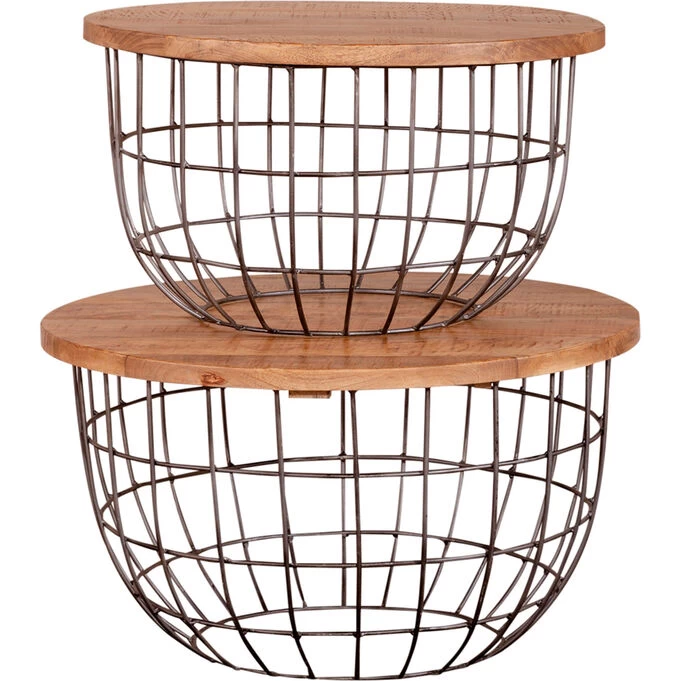 Enhance your home with the striking Akins Nesting Coffee Tables, a fusion of urban style and functionality. Crafted from mango wood with a weathered honey finish and supported by pewter bases, these two tables boast solid mango tops resting on robust wire basket bases. Their uniqueness stands out, elevating your space effortlessly. Whether grouped together for a striking coffee table or separated as chic side tables, these pieces redefine versatility in home decor. Embrace their casual yet distinctive statement, accentuating your urban living with the charm and character of the stunning Akins Nesting Coffee Tables, where style meets practicality seamlessly.
