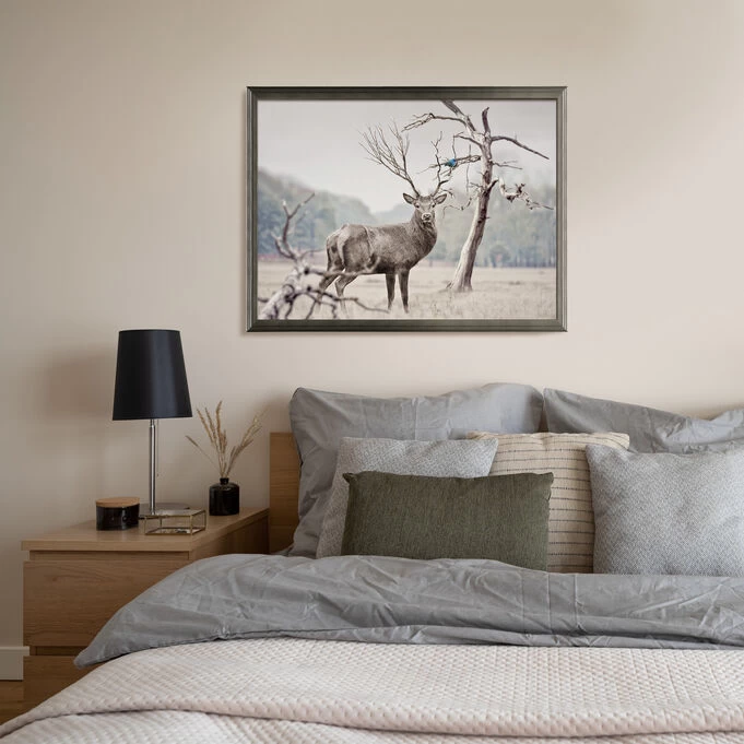 Liven up your space with the Alert Deer Wall Art print. It depicts a majestic stag with impressive antlers alert startled to alertness by a sudden motion or sound. The bluebird perched in the tree branch – or is it nestled in the antlers — brings a pop of bright color to the composition. The gentle colors in this print complement a variety of color schemes from neutral to colorful, giving the eye a pleasingly serene place to rest. Add the Alert Deer Wall Art print to your living room, bedroom, guest room, home office, dining room or entryway for a touch of rustic charm.
