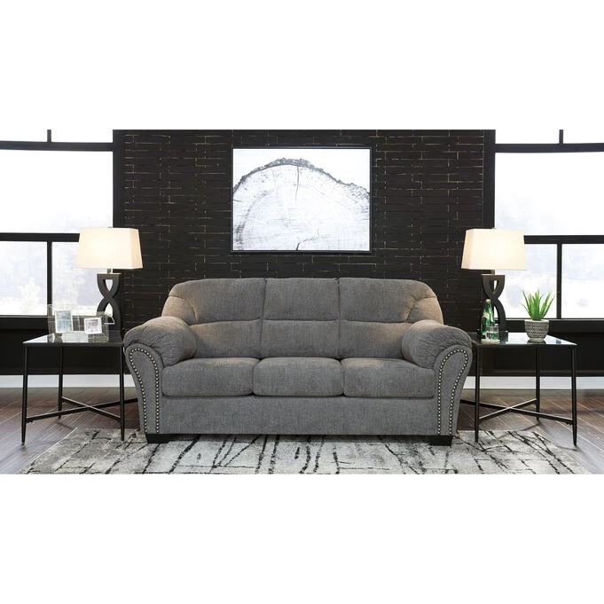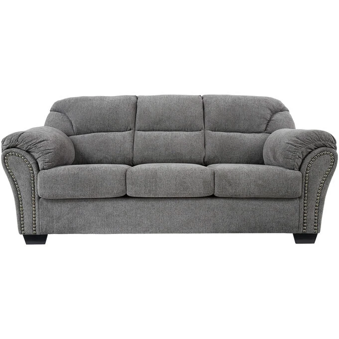 Style and comfort co-exist with the pewter gray/silver Allmaxx Sofa. The chic divided back design and pillow-top wrapped armrests will make this a favorite spot for power naps. And with a platform foundation system that resists sagging three times better than spring systems, you’ll appreciate the extra support. You’ll also love the way it looks, especially the black nickel nailhead trim, exposed feet with a faux wood finish, and attached cushions.