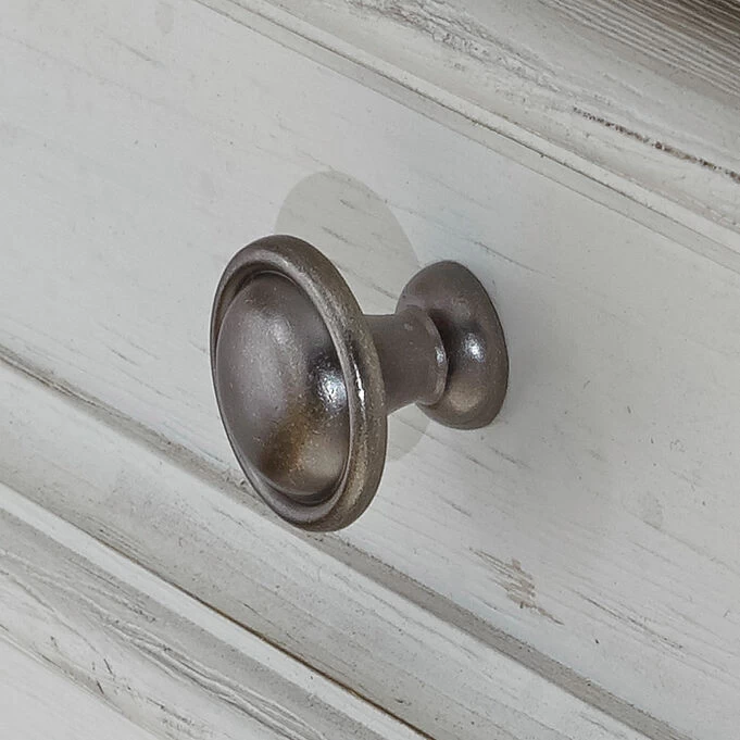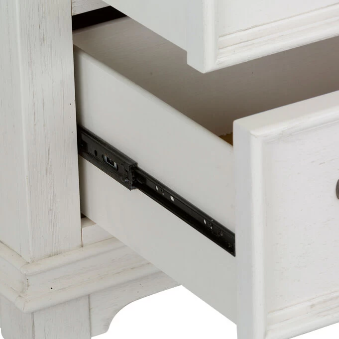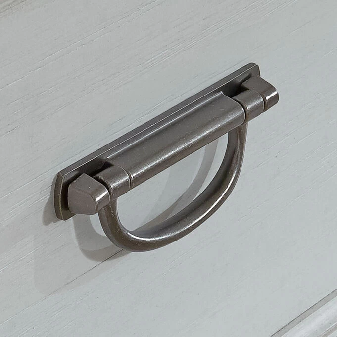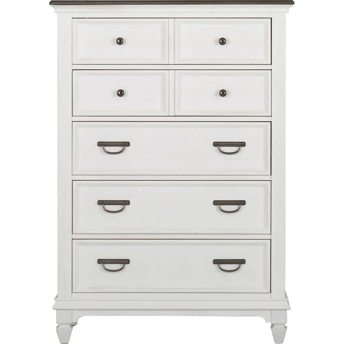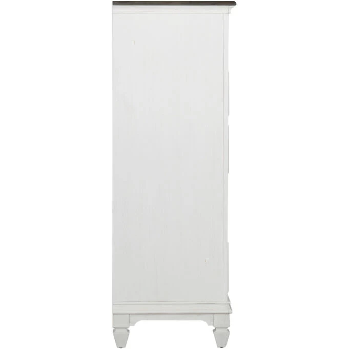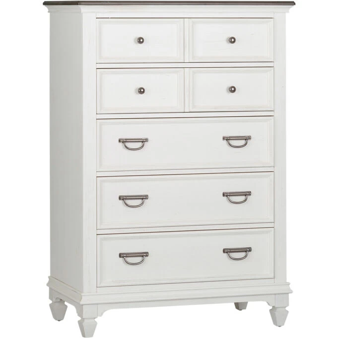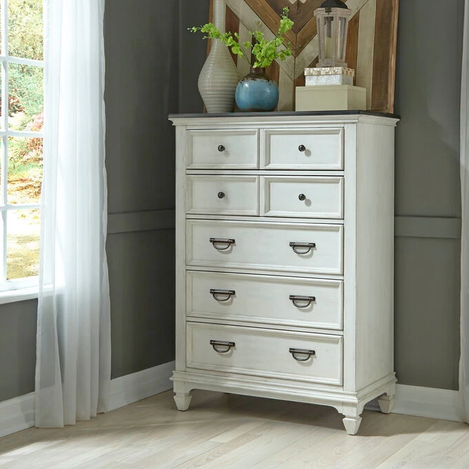 Enhance your room with the Allyson Park chest. Crafted with pine solids and veneers with cathedral white oak tops, this piece features felt lined top drawers, fully stained interior drawers, beautiful bead molding, and is anchored by tapered feet. The two-toned wire brush finish with charcoal tops paired with the antique pewter knob and drop bail hardware designs a look that is versatile and would look good in any home, from a beach house to a big city loft.