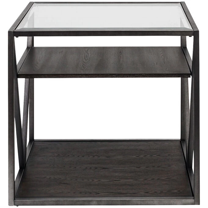 Flaunt your sense of style with the Arista end table as part of your urban loft or industrial home. This small table is all angular metal tubing and glass, with two ash veneer wooden shelves. The top is made of beveled tempered glass and the bottom shelf is wood. A smaller wooden shelf floats between them for a unique look and extra storage. Add this end table to other pieces in the Arista collection for a modern vibe you’ll love to come home to.
