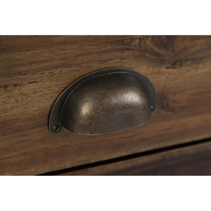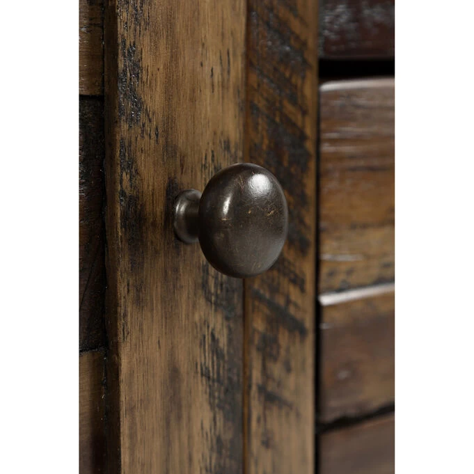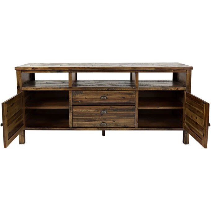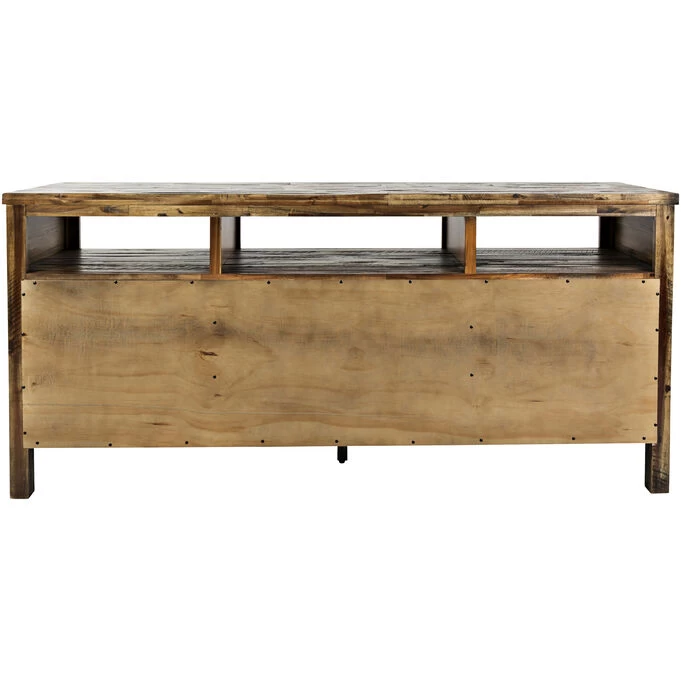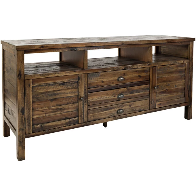 The Artisans Craft 70 inch console has the look of a handmade piece of furniture. Purposefully distressed and rough-hewn, it’s brimming with rustic personality. Use this console as a stand for your big-screen TV, in the dining room as a sideboard, or in the kitchen for small appliances and dishes. Antiqued cup drawer pulls add the perfect finishing touch to this accent table. Made of acacia wood.