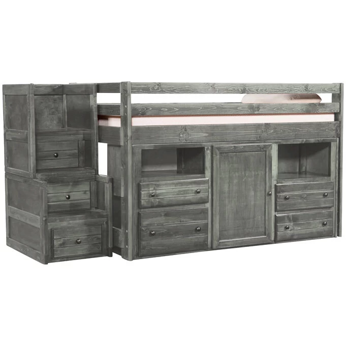 The Bayview loft bed with super dresser gives your child’s bedroom or any small space so many options. Constructed of solid pine, it’s the perfect base to start from. The included super dresser supplies great storage options, both with drawers and hidden behind a door. Pewter knobs give the dresser extra pop. Add an optional reversible stairway for more fun and style.
