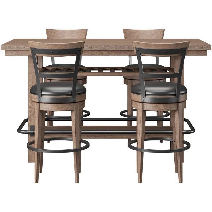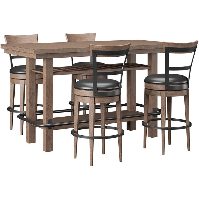 The Benton 5 Piece Swivel Dining Set is causal and inviting, and the perfect spot to gather with family and friends. Oak veneers are finished in a warm, pecan brown and the table boasts a solid lower shelf which offers a great storage spot. Plus, a slatted shelf easily holds dishes, barware, or wine bottles. A metal foot rail around the table and each stool assures the set will stand up to the rigors of everyday use.
