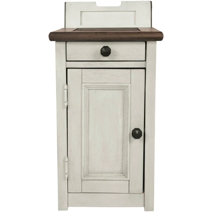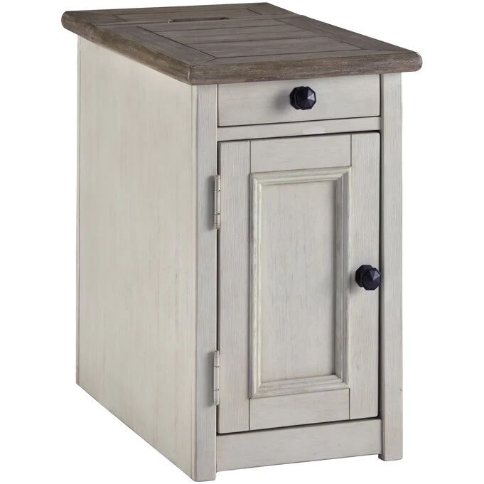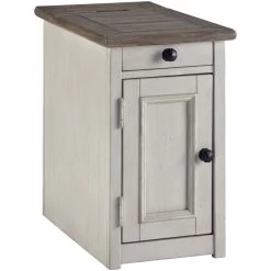 The Bolanburg chairside table complements your farmhouse, shabby chic or country cottage décor to perfection. This two-tone accent table has a plank-and-frame style top with a hidden panel that opens to reveal a pair of USB ports and electrical outlets. Crafted of select hardwood solids, veneers, and engineered wood, this table has a gently distressed antique white finish, accented with faceted black knobs. With a door compartment and pull-out tray, this compact end table puts convenience and storage at your fingertips.