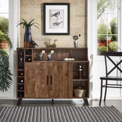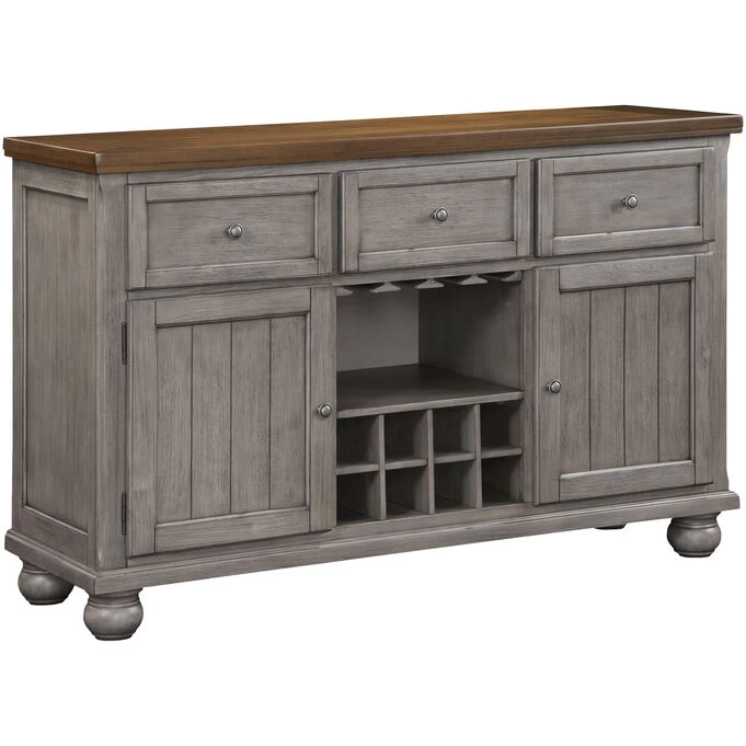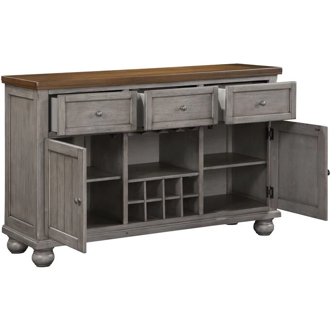 The traditional styling of the Carolina Collection lends timeless appeal to the look of your casual dining space. With subtle hints nodding to the Arts and Crafts design movement, the server features classic lines that solidify the versatile aesthetic of the collection. The server has drawer and behind door storage allowing for quick and convenient access to your decorative tabletop items as well as a wine rack and stemmed glassware rack. A traditional two-tone cherry and gray finish is utilized to highlight the collection’s acacia veneer.