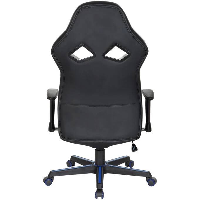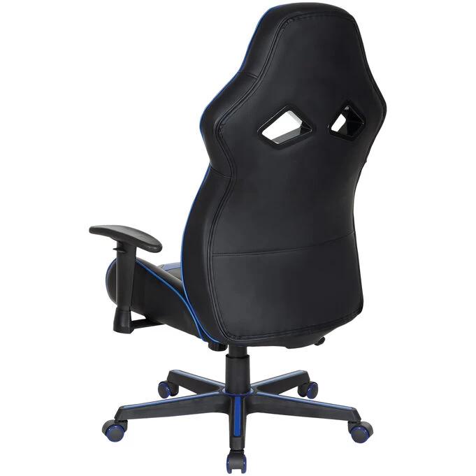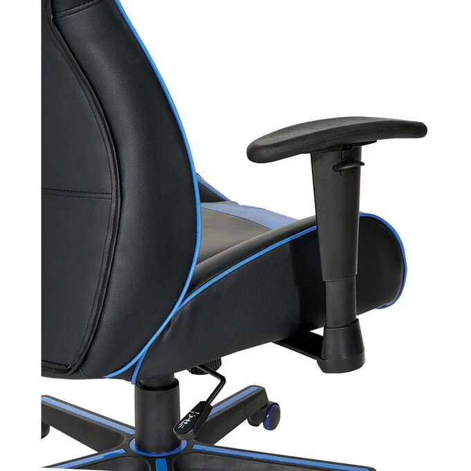Stay in the game and vaporize your competition with the Cobra Gaming Chair. The adjustable arms, built-in lumbar support, thick foam seat, coil springs and headrest offer you hours of focused comfort. Quick one-touch pneumatic seat adjustments, full 360-degree rotation, and locking tilt control give you the edge you need to crush your competition. The integrated cooling airflow at the shoulder and neck points keeps you comfortable and the perforated airflow material keeps your seat naturally cool. The chair cleans up with just a wipe and the five-star rated nylon base features dual-wheel casters that move easily and stand up to dirt and scuffs.