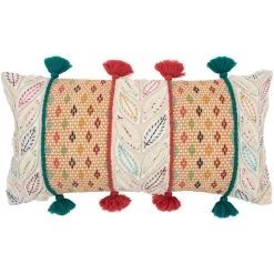The Collected Culture Natural Textured Fringe Lumbar Pillow features a unique design with lots of pops of color. The natural materials and whimsical folk design elements of this cotton pillow are so charming. It’s designed to stand out, so don’t worry if your space doesn’t match the jewel-toned color palette of this asymmetrical fringe pillow exactly. This fringed pillow will become the focal point of any beautiful pillow arrangement. The bohemian pillow has a handspun, crafty feel that is sure to add warmth to your space. It coordinates perfectly with the selection of throw pillows from Collected Culture.