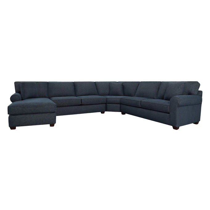 The Connections Roll 4 Piece Left Chaise Wedge Sectional is the ideal choice if you are searching for a distinctive and visually stunning seating arrangement. Crafted in the USA, this sectional offers customization in style, fabric, color, and configuration, that can be tailored to harmonize with your space. Featuring a robust wood frame, resilient foam, and fiber-filled cushions, it showcases easy-care fabric upholstery in three adaptable solid hues. Designed for flexibility in various room layouts, it ensures durability with hardwood and plywood frame construction, sinuous spring seat decking, and fiber-wrapped foam cushion cores. This Slumberland exclusive brings style, quality and classic sophistication to your home.