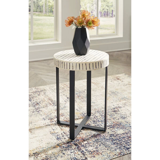 The stunning Crewridge Accent Table is a modern piece of furniture that adds a subtle sense of coolness to your decor. The top of the table features a cream and black bone inlay that creates visual intrigue and texture, while the black base is sleekly styled, providing balance to the overall look. This versatile accent table can be used in entryways, living rooms, dining rooms, family rooms, offices and bedrooms. Whether placed front and center or tucked into a corner, the Crewridge Accent Table adds function and character to any space and serves as the perfect finishing touch your room needs.