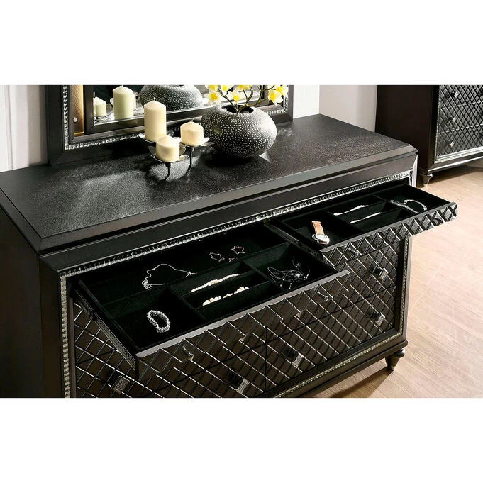 Give your house a high roller suite with this ravishing bed. Every single inch of this ensemble holds something for you to enjoy, all the way down to the silver toe carved bun feet. Pebble boxed paneling canvases the collection’s drawer faces and headboard side paneling. This unmistakable paneling is accented by beveled mirror trimming and acrylic encrusted drawer handles. The play on shape and texture is not lost on the headboard’s button tufted fabric mantle, raised just above the pebbling and back lit by LEDs. – Product Details provided by Manufacturer, Slumberland not responsible for errors in information.