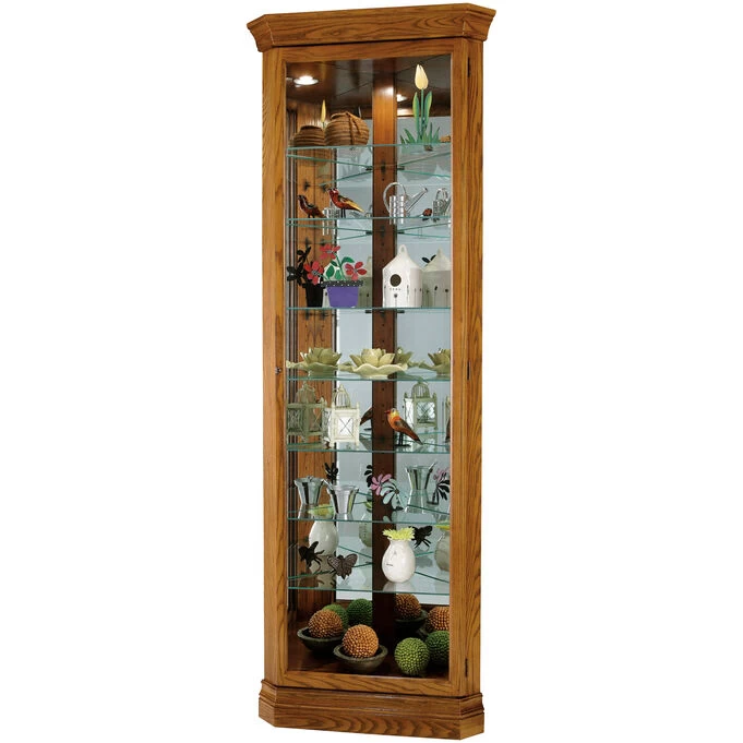 The Dominic corner curio showcases your collectibles in classic style. Crafted of select hardwoods and veneers, this curio cabinet is adorned with moulding on the top and bottom, and finished in legacy oak. Inside, seven adjustable glass shelves provide eight levels of display space. A mirrored back and interior light show off your treasures to perfection. Pad-Lock cushioned metal shelf clips increase stability and safety, and levelers under each corner assure stability on uneven floors.