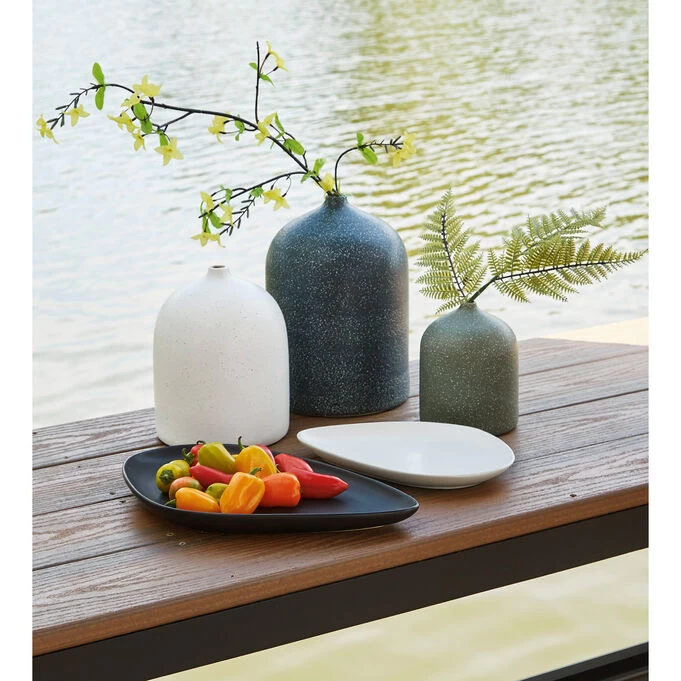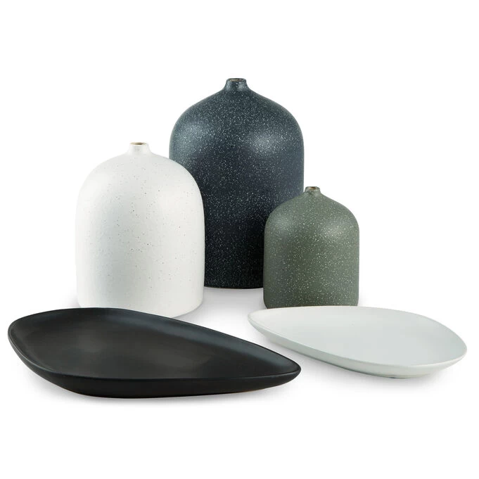 Liven up your home decor with the 5-piece Dorelia Accessory Set. The right accessories put the final touch on your home’s design style and this set doesn’t disappoint. Sure to lend a splash of color and style to any room, the bud vase trio and two trays feature navy, green, black and white matte glazed finishes. The vases come in different heights, adding visual interest to your coffee table or dining room table. The two trays are perfect for serving or adding texture to your tablescape. The pieces, crafted from ceramic, are perfect for console and side table flair, or as mood-setting centerpiece anchors.