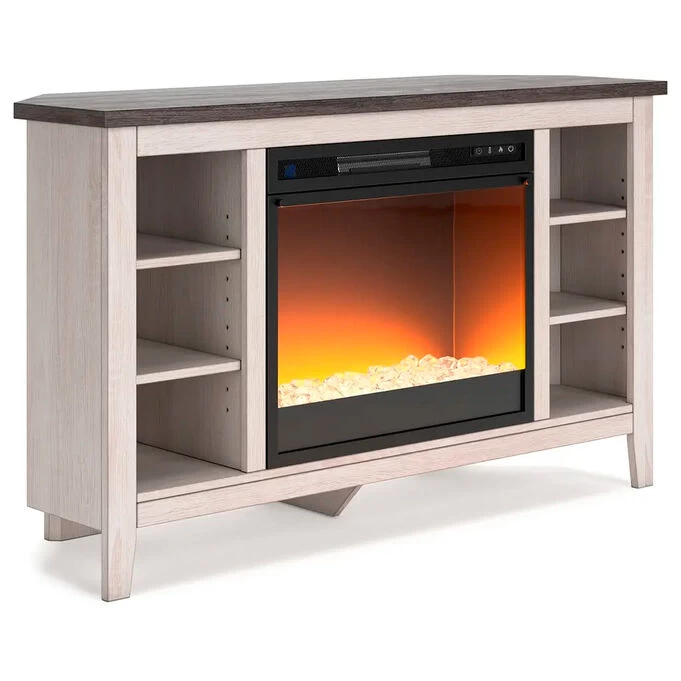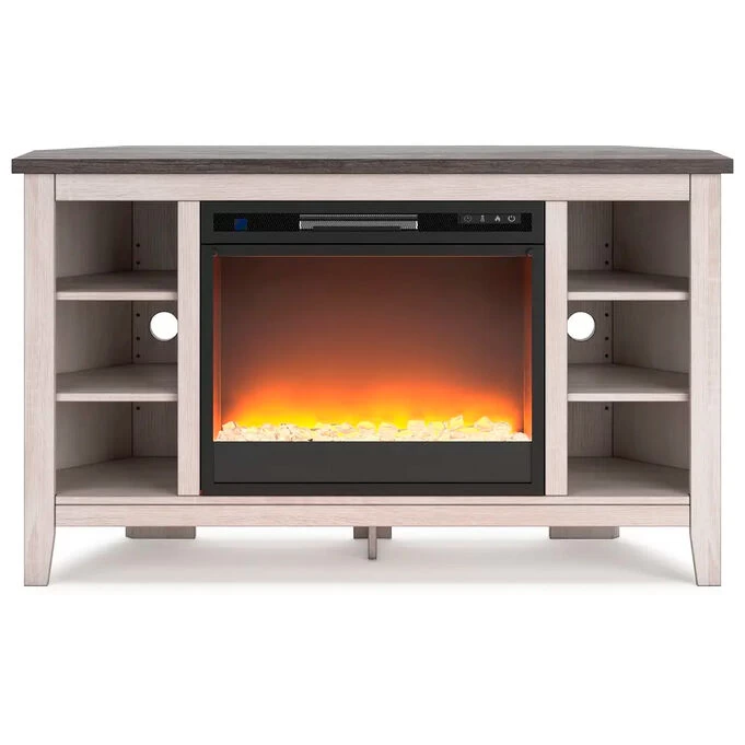 With its minimalist charm, this corner TV stand is right in tune with your relaxed approach to high style. Beautifully shaped to nestle into any corner, it’s well equipped with a flexible, open-concept design and cutouts for wire management that enhance the clean-lined aesthetic. Adding that much more show-stopping style: an LED fireplace insert that operates with or without heat and includes a six-level temperature setting, remote control and overheating control for added safety. The fireplace comes with optional faux glass crystals and natural stones, so you can customize the look of the flame bed.
