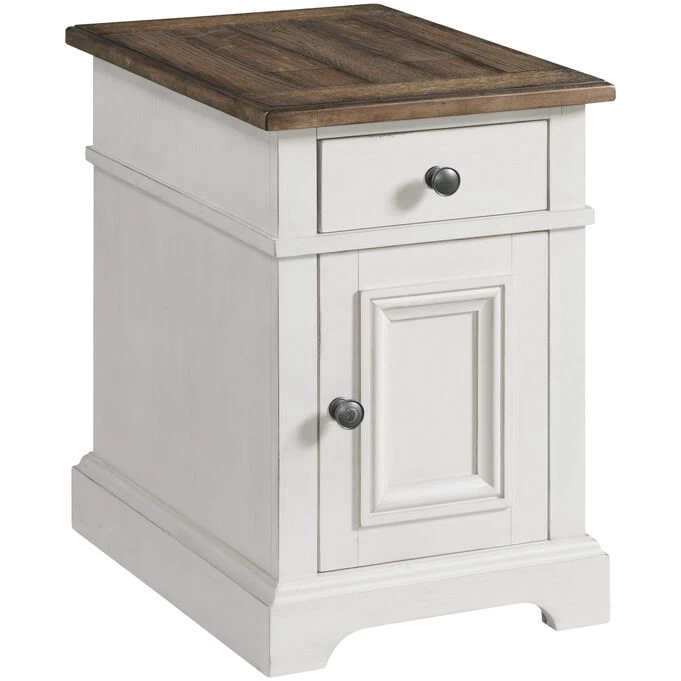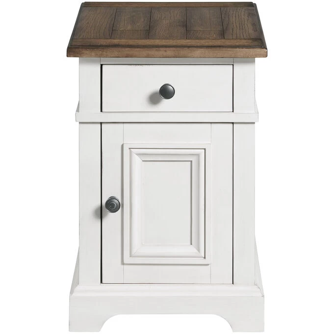 Complete your seating area with the darling Drake Chairside Table. The rustic white and stone finish perfectly embodies farmhouse chic style, while the compact design creates the perfect place to set down a drink or a book while you enjoy some “me-time” in your favorite armchair. Store your e-Reader, headphones, charging cables, and other must-haves, conveniently close by and hidden from view.