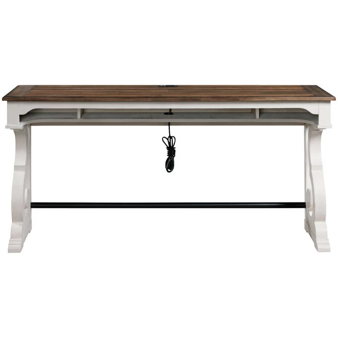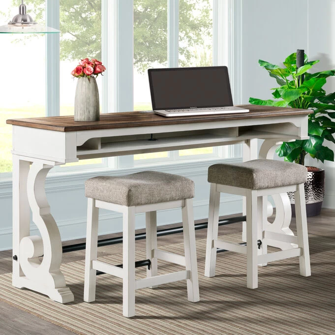 The Drake Bar Table boasts a traditional mission style and comes in an updated rustic white and stone finish. With a hidden shelf and electrical outlet, this bar is versatile and functional, and it can accommodate up to 3 bar stools so there is plenty of room for friends.