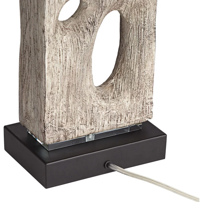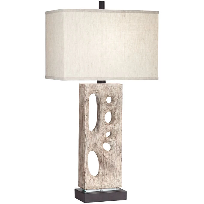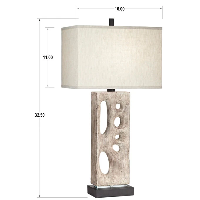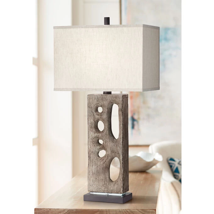 Bring a cool, casual coastal vibe into your home with the Driftwood Table Lamp. Randomly shaped and spaced cutouts and a hint of gleaming chrome add up to a stunning design that will definitely draw the attention of anyone who enters your home. A rectangular white, slightly textured linen shade sits atop this striking lamp, adding subtle elegance to the design. A blend of contemporary and coastal style elements, the lamp features a faux wood resin base. The wood-like texture gives the unusual lamp a natural look and feel, contrasted by the sharp angles of the rectangular base and shade.