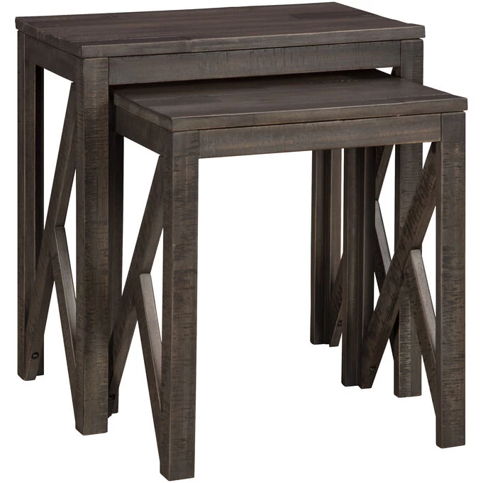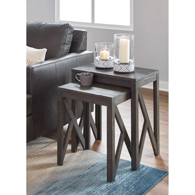 Looking for a versatile side table that doesn’t take up much space? Look no further than the Emerdale Nesting Table set. This table set adds a fresh modern farmhouse vibe to your home. They’re great for small living rooms and rooms where space it at a premium. They can be used as an end table in the family room or a night table in your bedroom. Stacked together, they add a unique decorative element that becomes a practical solution when extra tablespace is needed. Both tables feature clean-lined design and crossbuck bases enriched by a washed gray finish. Offset plank details introduce an additional touch of charm.