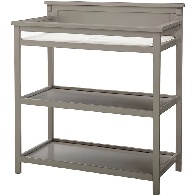 The transitional style of the Emery changing table with shelves is perfect for your little one’s nursery. The top shelf has room for a contoured changing pad, and the two sturdy shelves below give you plenty of room for diapers, wipes, washcloths, and onesies. The extended panel backing on the top shelf means that your baby can’t roll away from you. Made of solid pine, this changing table is a perfect addition to the other pieces in the Emery collection.