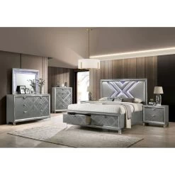 The enticing combination of glamour and Art Deco has long been attempted, but rarely with such successful results as achieved with this set. It is a visual masterpiece, harkening to the days of Old Hollywood while establishing a rich, dynamic concept for the bedroom. The embroidered padded headboard shines as if illuminated. The jewel-carved faux glass feet support the components with regal authority. Classic embossed patterns tie the set together in one magnificent and highly desirable theme. – Product Details provided by Manufacturer, Slumberland not responsible for errors in information.