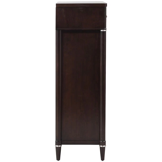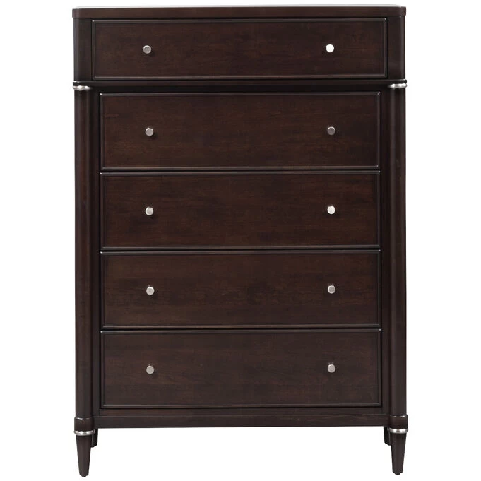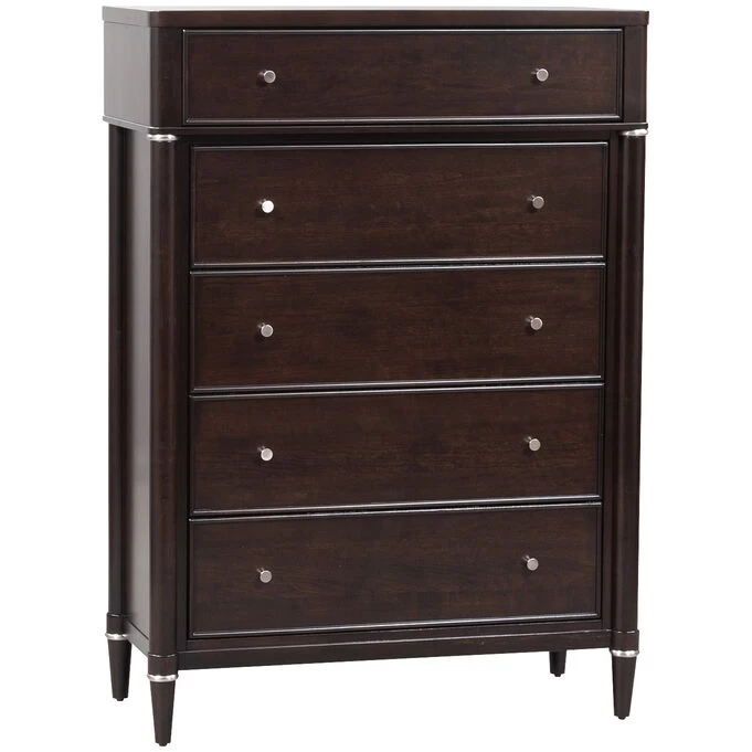 The Essex chest is both traditional and timeless. Crafted of rubberwood solids with a gorgeous cherry veneer, it has brushed nickel drawer pulls and accent bands for a distinctive look. All drawers feature dovetail construction front and back, and full-extension drawer glides with ball bearings for smooth operation. The top drawer is felt-lined, and the bottom drawers are cedar-lined. Match this 5-drawer bedroom chest with the rest of the Essex collection for a distinctive new look.