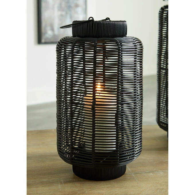 Bring a casual look and feel to your indoor or outdoor spaces with the Evonne Small Lantern. Pair it with the Evonne Large Lantern to make a stunning statement in your living room, bedroom or entryway. Its woven black faux rattan body filters candlelight to fill your space with a gentle glow. Whether your interior design is boho, shabby chic, modern, eclectic, transitional, or traditional, this versatile piece fits right in. When not in use, this chic indoor/outdoor piece rounds out your decor with its versatile style. The Evonne Small Lantern adds a touch of warmth and comfort to any room.