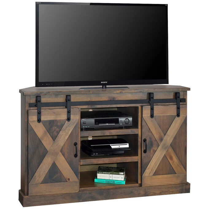 Style and tradition meet the needs of today in the Farmhouse 56 Inch Corner Console. Made from various solids and veneers and finished in a beautiful rustic finish, this piece will make a statement in your den or family room.