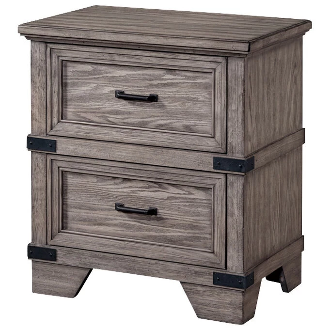 If strong and traditional is your style, then the Forge nightstand was made for you. Made of wire-rubbed oak veneer and hardwood solids with a brushed steel finish, this 2 drawer nightstand will make a statement in your bedroom. Two large drawers with English and French dovetail construction and full extension glides offer ample storage for bedside necessities. Each drawer has a metal pull handle, and matching metal brackets are attached to the corners to tie in with the design of other pieces in the Forge collection. Best of all, the nightstand has a USB port and an electric outlet because traditional style still needs modern convenience.