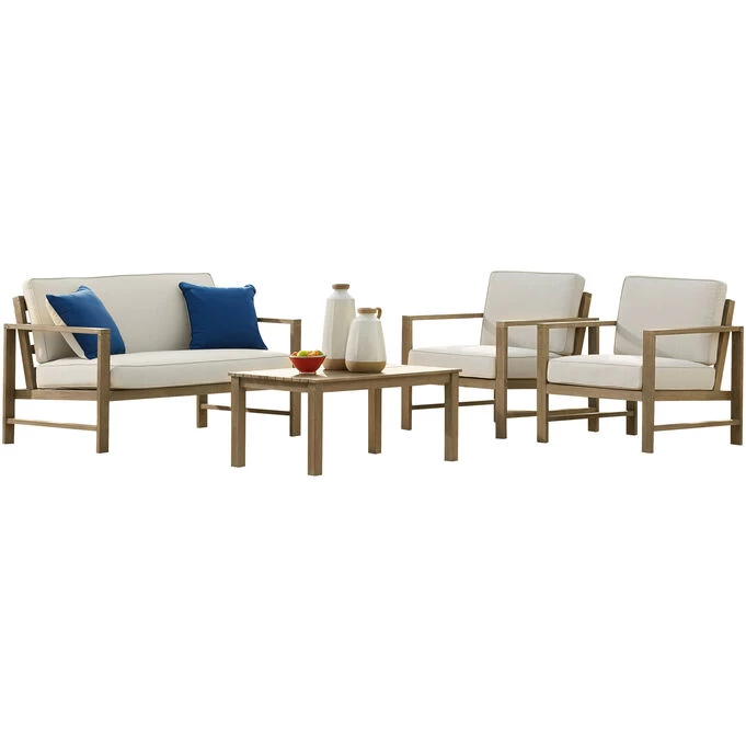 With its sleek lines, gorgeous driftwood tone, and cushioned comfort, this 4-piece set makes your outdoor living space feel like an upscale resort. Made for looks and longevity, this high-quality ensemble ready to brave the elements. Built from eucalyptus wood treated to a deluxe, embossed finish, each piece is designed to last beautifully for years to come. Thick, all-weather seat cushions and back pillows are wrapped in a delightfully neutral Nuvella® fabric that pairs well with existing décor and is a breeze to clean.