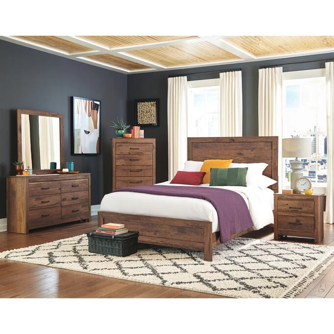 Enhance the ambiance of your bedroom with the Gilliam 4 Piece Room Group. This set includes a carefully crafted low-profile bed frame with a matching dresser, mirror, and nightstand, all featuring a breathtaking Aspen oak finish. The dresser has six deep drawers, providing ample storage space for t-shirts, jeans, shorts, and more. The nightstand sits snugly beside the bed, ensuring that your bedtime essentials are within reach when needed. The sleek drawer bar handles and side glides on the flat panel drawer fronts add to the set’s elegance. The Gilliam 4 Piece Room Group is sure to elevate the overall design of your bedroom.
