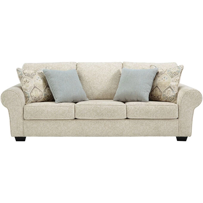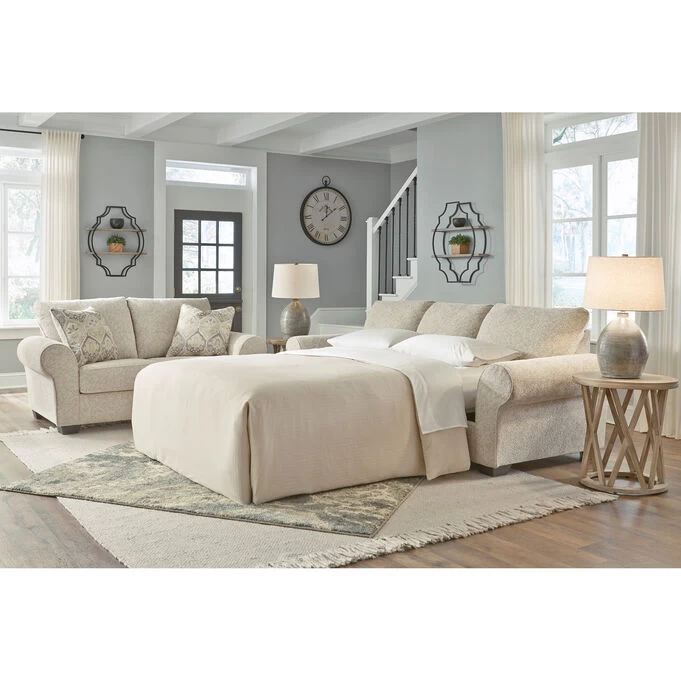 Blending classic elements like sumptuous flared roll arms with tailored box cushions and tapered black feet for up-to-date appeal, this sofa sleeper exudes that transitional aesthetic that looks and feels right at home. Offering plenty of room for everyone to make themselves comfortable, this large-scale sofa is wrapped in a soft, chunky weave fabric loaded in texture. Light and lovely ivory upholstery makes for such an easy-breezy blend. Made of quality memory foam, the pull-out queen mattress comfortably accommodates overnight guests. – Product Details provided by Manufacturer, Slumberland not responsible for errors in information.