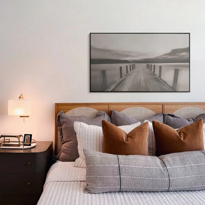 The Heartland Home The Dock Wall Art is a unique and elegant piece of decoration to add to your home. This landscape art depicts a body of water with a dock extending out towards the horizon in the middle of it. This cultured piece of art will signal to any guests in your home that your home is a refined one in which art is appreciated. Hang it in your living room or in a hallway to display. This painting adds a touch of excitement to any home it is placed in, and it is suitable for just about any type of home décor, so get one now!