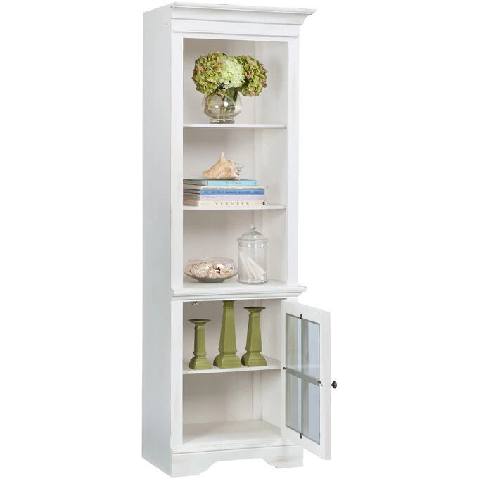 The Hyland Right Pier is a bookcase and storage space all in one. Available in Antique White and Antique Gray, you have three adjustable shelves to work with, along with two additional shelves behind a glass door. With the multi-step hand distressed finish adding to the farmhouse look, you can be sure this piece makes a beautiful accent in any room it’s in.
