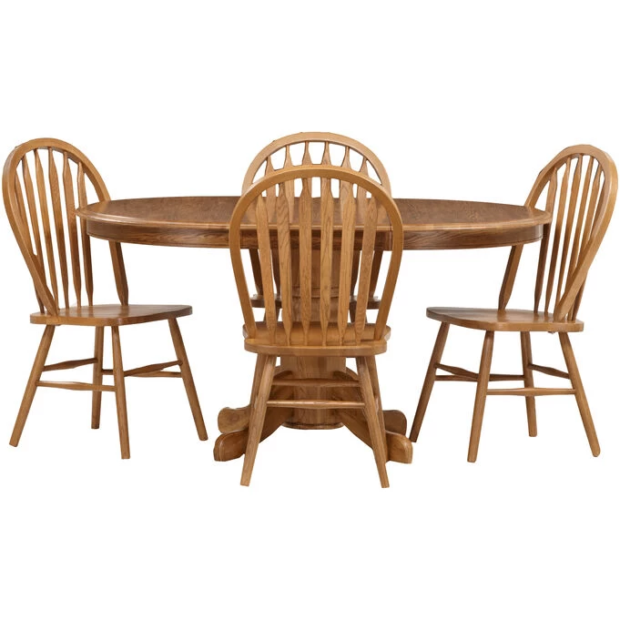 If you’re looking for classic, reliable furniture you’ll live with for years, the Jefferson 5-piece dining set is your choice. The arrow back chairs and pedestal table are crafted to resemble 19th Century antiques, with a lacquered chestnut finish and faux carved detailing. The chairs are made of solid oak, and the table is made of oak solids and veneers with a laminate finish for worry-free daily wear. This dining room set is destined to be in the family for years.