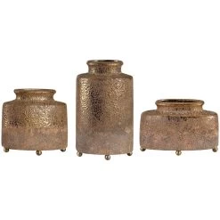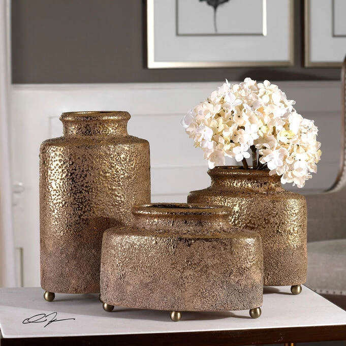 Set of 3 ceramic vessels dipped from the top in a metallic golden glaze.