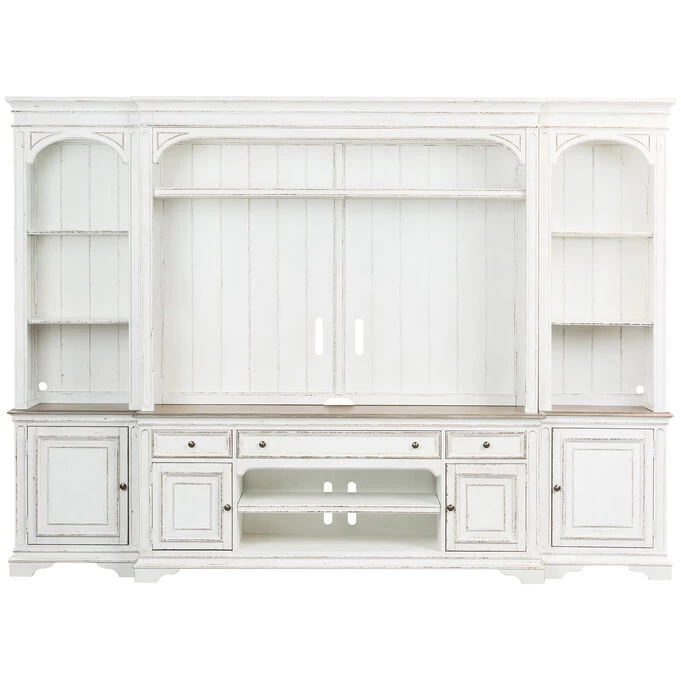 Looking for the main installation in your modern farmhouse or classic countryside living room? Look no further than the Magnolia Manor Antique White 4 Piece Wall. Complete with wire management provisions to keep your electronics in an orderly fashion, fully stained interior drawers for elegance, bracket feet for durability, and LED touch lighting for the most modern features, this is an entertainment wall you’re sure to love.