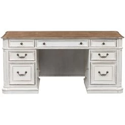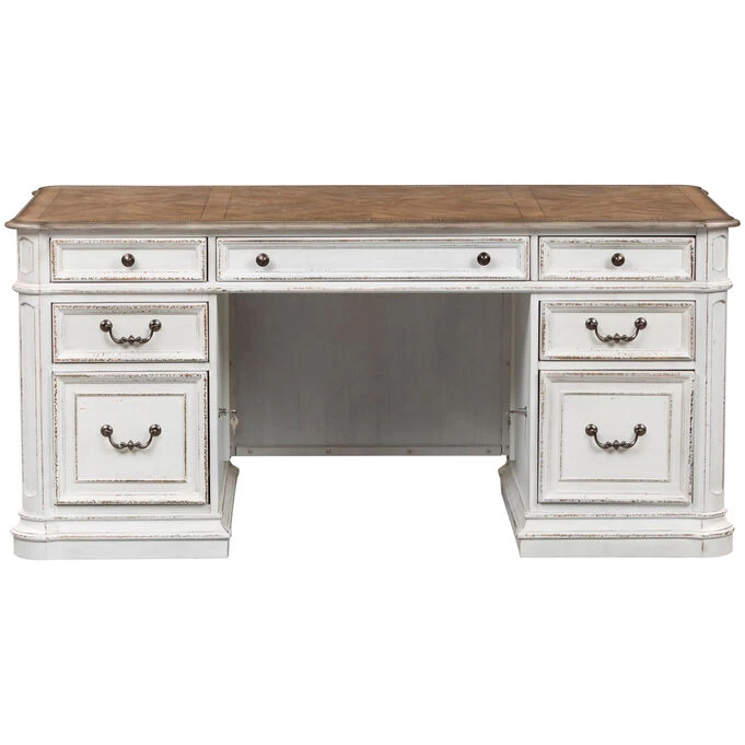 Create the perfect home office with the traditional Magnolia Manor Desk. This executive desk features drawers that are fully stained inside and offer plenty of space to store important paperwork and essential office supplies. The hidden flip-down keyboard tray looks like a standard drawer but keeps your keyboard out of site when not in use and lets you work in comfort for hours when needed. Traditional elements such as framed drawer fronts and canted corners make this a piece that will fit into a number of interior design styles, such as farmhouse, cottage core, eclectic and boho. This mix of style and functionality makes the Magnolia Manor Desk an ideal addition to any home office.