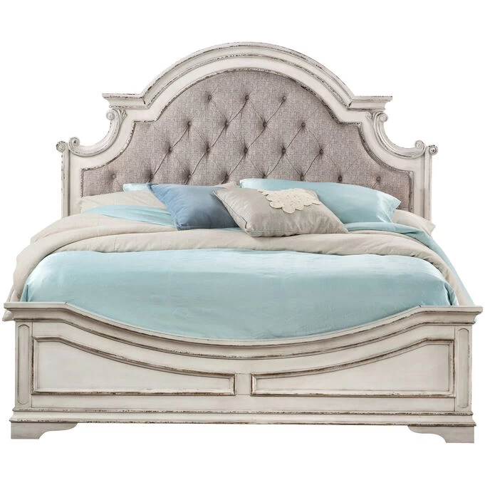 The Magnolia Manor upholstered bed is crafted in the grand European tradition. Classic design and artistic distressing give this bed a shabby chic elegance that never goes out of style. The button tufted headboard offers you the comfort you need for sitting up in bed, and the elegant lines create a timeless heirloom look you’ll love. The Magnolia Manor collection is made of poplar solids with white oak and birch veneers.