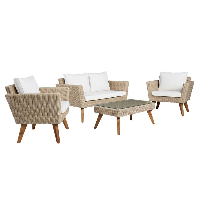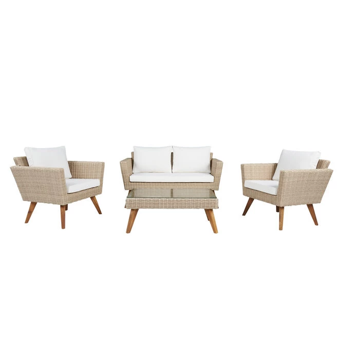 A great way to relax. This outdoor group with loveseat , 2 chairs, and cocktail will not disappoint. A great transitional style that will go in almost any setting . The woven material is in a sand finish. Seat & back cushions are extremely comfortable and upholstered in a correlating Off- White fabric that is very durable. Glass top cocktail table is perfect for your morning coffee or afternoon cocktails. This group will entice you to sit outdoors all the time. – Product Details provided by Manufacturer, Slumberland not responsible for errors in information.