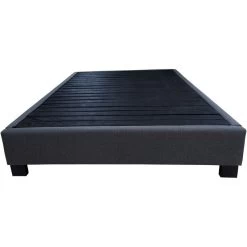 The Modern bed frame takes the place of both a metal frame and a box spring/foundation. Handsomely styled, it’s fully upholstered, so no need to cover it up with a bed skirt—and no hard edges to worry about. Quick and easy to assemble, this durable foundation has drop-in rails, a Velcro-attached slat roll, and a clip-in center support with legs.