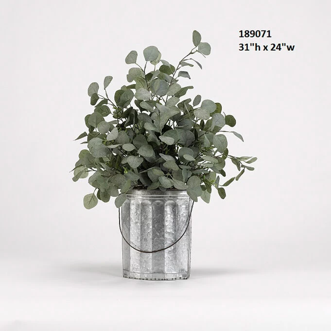 The stunning Modern Farm Eucalyptus in Metal Planter is an exquisite addition to your home décor. This arrangement features incredibly realistic eucalyptus stems that are nestled in a rustic galvanized metal bucket planter, creating an enchanting display that will elevate the ambiance of any room. The soft and natural greens of the eucalyptus perfectly complement the distressed styling of the metal bucket, making it an ideal fit for a farmhouse aesthetic. Whether you decide to place it on your kitchen island, coffee table, sideboard, windowsill, or office desk, the soft and natural greens will add an invigorating touch of the outdoors to your home decor.