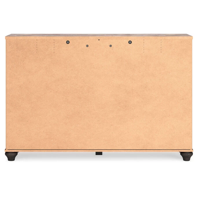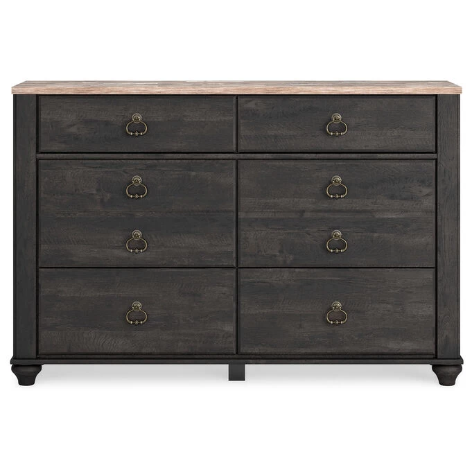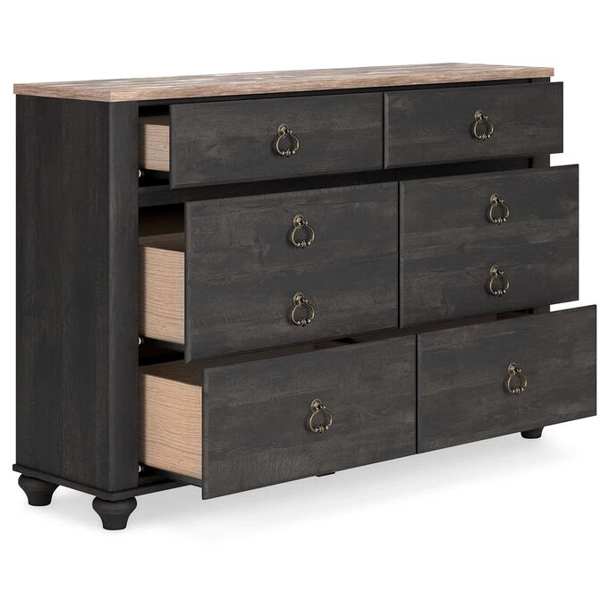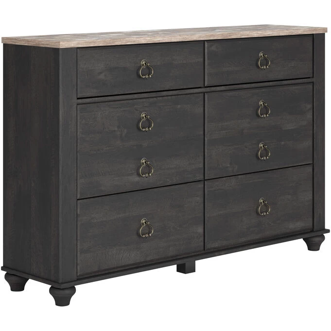 Discover the exquisite Nanforth Dresser, where the timeless allure of French farmhouse aesthetics meets deep, industrial-inspired design. This sleek dresser is a harmonious fusion of simplicity and yesteryear luxury, featuring a distinct two-tone finish that boldly marries rustic charcoal with authentic oak grain replication. The wood-grained block pattern adds an old-world charm, accentuated by antiqued brass-tone ring pull hardware that provide charming vintage flair. With six smooth-gliding drawers, the Nanforth Dresser offers a perfect storage solution for t-shirts, sweaters, jeans and more. Its functionality perfectly complements your unique taste for vintage-inspired design, making it a standout addition to your home decor.