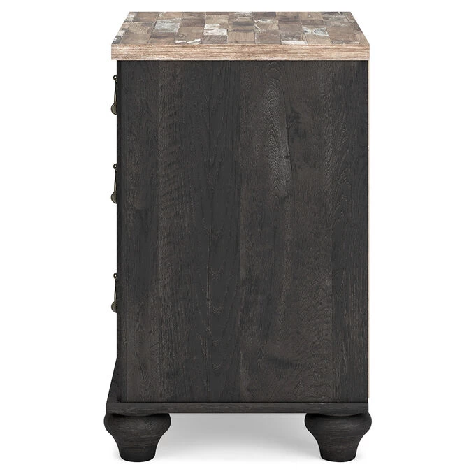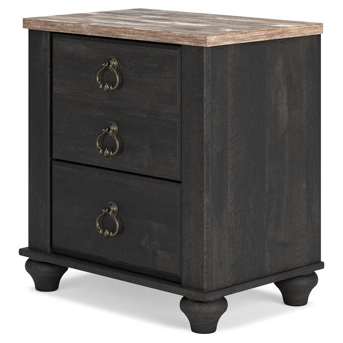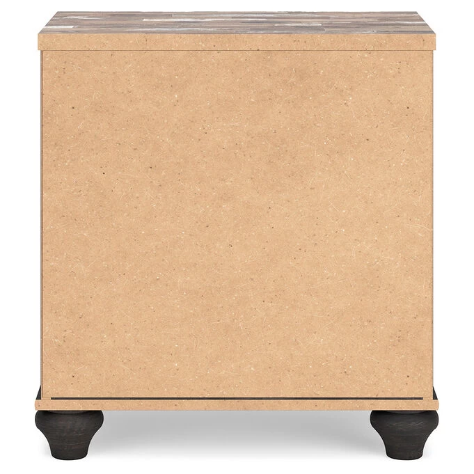 A little bit French country, a little bit industrial chic, the Nanforth Nightstand brings stunning elegance to your bedroom. This exquisite piece strikes the perfect balance between timeless simplicity and luxurious yesteryear details. The unique two-tone finish, with its deep rustic charcoal color overlaying replicated oak grain, exudes originality and charm. The wood-grained block pattern, complete with an authentic touch, embodies vintage design. Its antiqued brass-tone ring pull hardware, accentuated with white paint, adds a nostalgic touch. With two smooth-gliding drawers for your bedside storage needs and two slim-profile USB charging ports for your convenience, this nightstand seamlessly combines functionality with vintage-inspired decor.