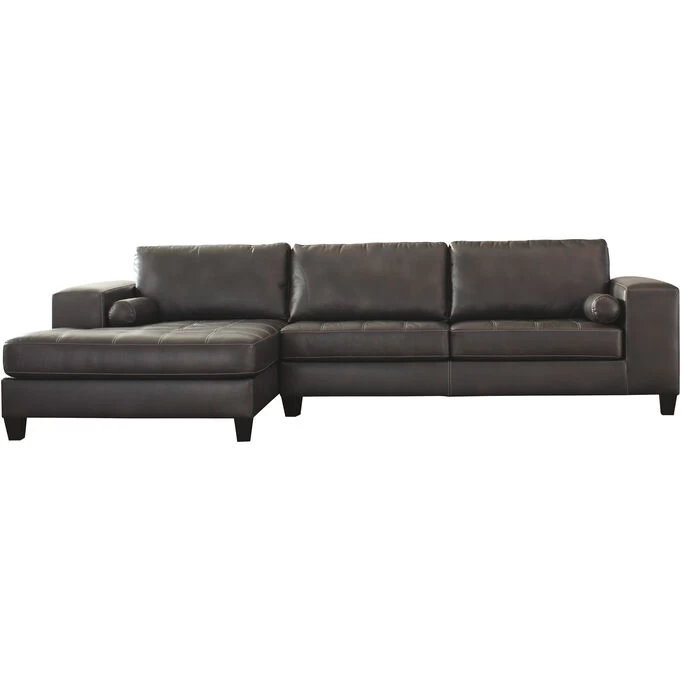 Let’s talk about sleek and we’ll talk about the Nokomis 2 Piece Chaise Sectional. First, check out the low back seating and wide track arms; next, take a look at the gray/silver faux leather with an embossed natural grain effect and matte finish. Then, we have tufting on the seats, bolster pillows to support the arms and just enough padding in all the right places to add to its comfort. Includes left-arm facing corner chaise and right-arm facing sofa.