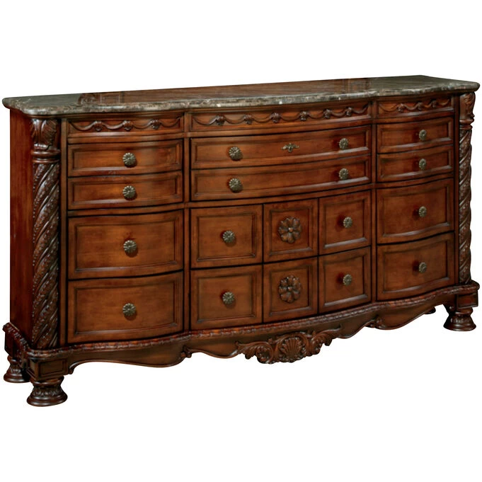 Inspired by the grandeur and grace of Old World style, this dresser is nothing short of stunning. A choice blend of materials is accented by detailed ornamental appliques. A marble parquetry top completes the opulent look. Nine smooth-gliding drawers serve your storage needs exceptionally well. – Product Details provided by Manufacturer, Slumberland not responsible for errors in information.