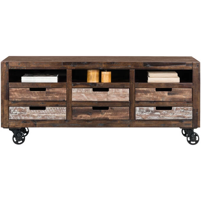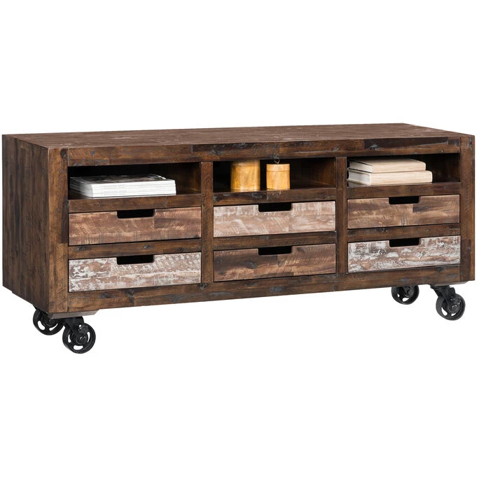 The Painted Canyon console brings a touch of American craftsmanship into your living room. Made of solid wood, the variations in color and distressed finish give this piece a real artisan look that works well in any casual décor. Perfect as a TV console, it has open shelves with cord management holes in the back, and pull-out drawers for electronic accessories. The drawers have have a whitewashed finish for a great contrast.