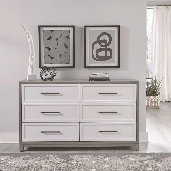 Add a touch of coastal elegance to your bedroom with the two-toned Palmetto Heights Dresser. Made with rubberwood solids and white oak veneers, the dresser has six full-extension drawers accented with pewter wash bar pull hardware that offer plenty of storage. The picture frame outlined in driftwood highlights the shell-white finish on the drawers, blending the best of coastal and contemporary casual living. The six drawers give you a ton of storage space, and the dresser’s block foot base accentuates its clean, simple lines. Bring a new level of casual, comfortable sophistication to your home with the Palmetto Heights dresser.